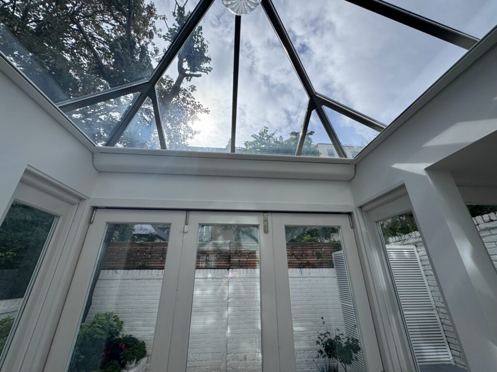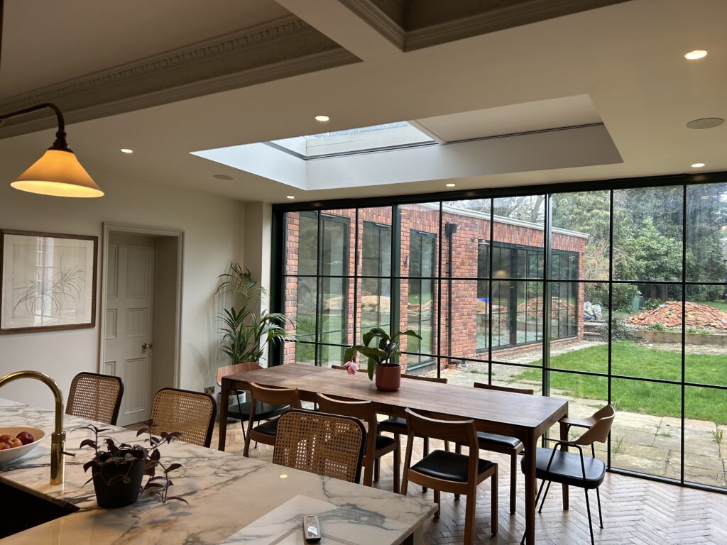 Some systems can position the side channels directly beneath the roof lantern. This helps the hardware sit neatly within the architecture and keeps the sightlines clean..